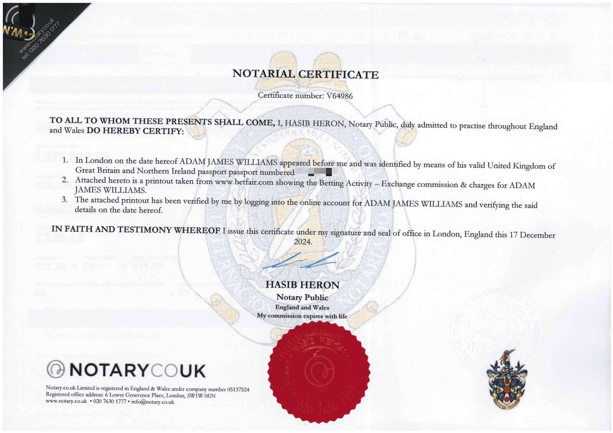 2. The notarial certificate (full disclosure: Adam’s passport number is blurred out – sorry trolls!) ![]()